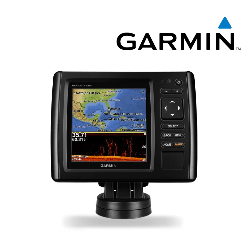 EchoMAP CHIRP 52cv con pantalla LCD de 5", GPS interno con mapa base mundial, sonar CHIRP tradicional 50/77/200 KHz y ClearVu de 500W (260/455/800 KHz). Incluye transductor CV20-TM y soportes de espejo de popa y motor de pesca.